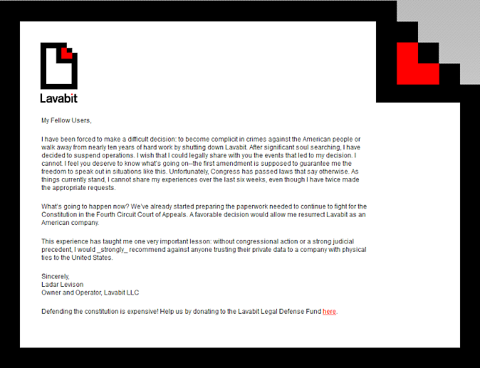 Lavabit, 2013. Ce service de messagerie sécurisé utilisé par Edward Snowden a été fermé par son fondateur après que le gouvernement américain ait exigé l’accès aux données des utilisateurs. Plutôt que de céder, il a choisi de fermer le service et de supprimer tous les comptes.