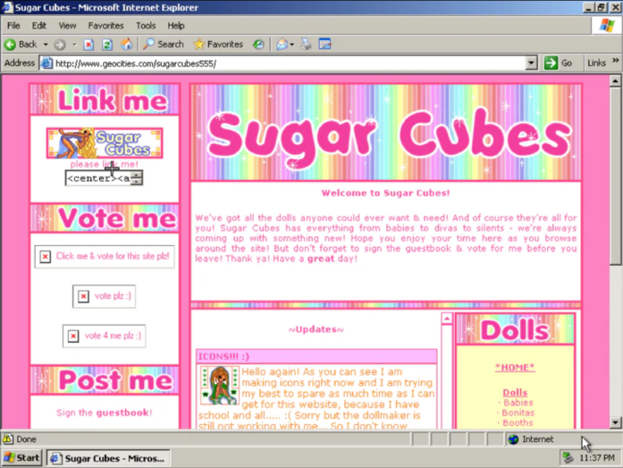 À mon avis, GeoCities est une pièce très intéressante de l’histoire d’Internet, et le fait que je n’en aurais même pas entendu parler sans mes recherches me fait presque mal physiquement. Parcourir ces vieilles pages datant d’il y a des années révèle une richesse d’humanité et de créativité. Certaines pages sont faites de manière assez professionnelle, d’autres sont un peu gênantes mais aussi tellement charmantes à leur façon. Des gifs brillants et animés, parfois un peu absurdes, des photos prises avec une caméra domestique, et une personnalisation sans limites. C’est exactement ce que j’imaginais la première fois que j’ai commencé à apprendre le code, et c’est cent pour cent ce qui rend l’ancien Internet si précieux à mes yeux.